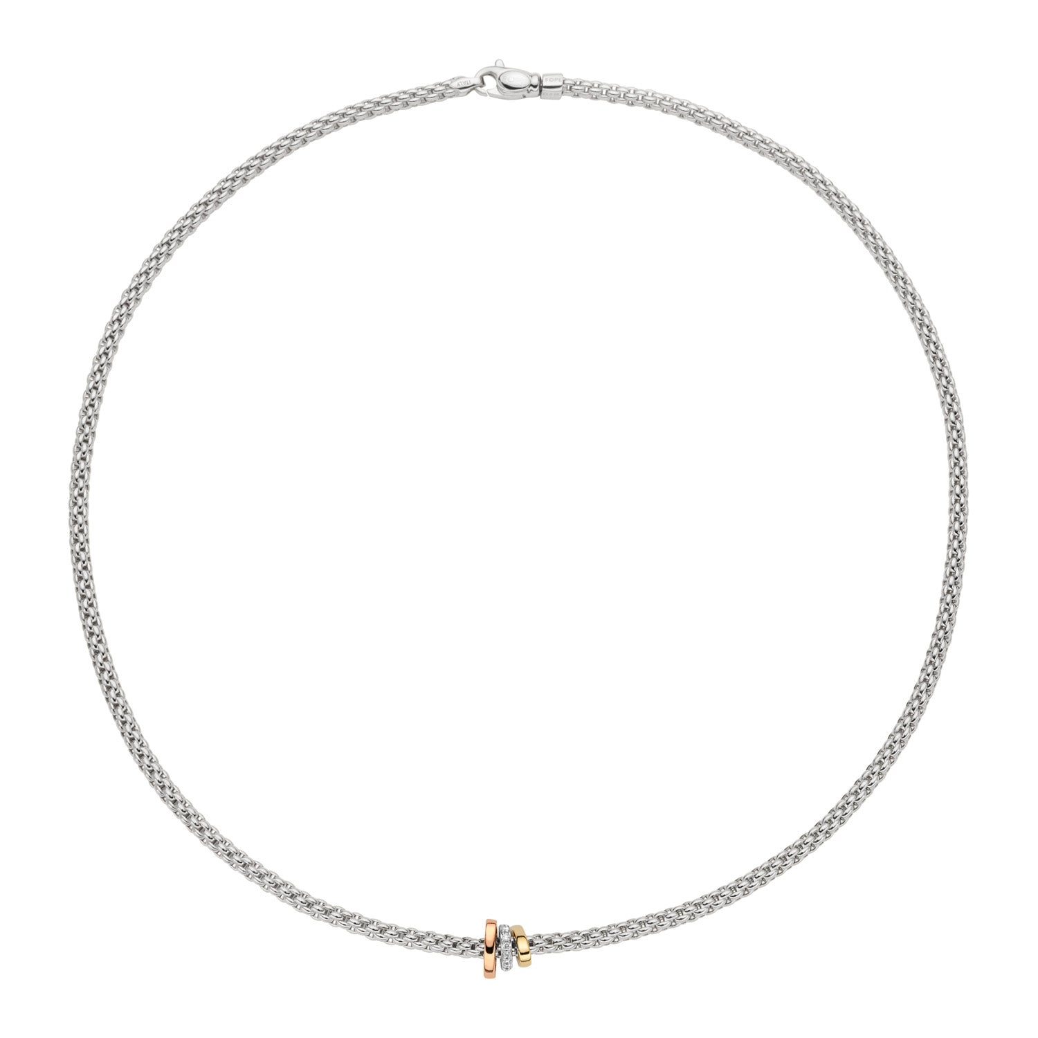 This elegant necklace from FOPE’s Prima collection offers a refined touch of sparkle within a sleek, contemporary silhouette. Crafted in 18ct rose, yellow, or white gold, the 43cm Prima chain sits gracefully along the collarbone, showcasing the collection’s signature smooth, flexible texture.