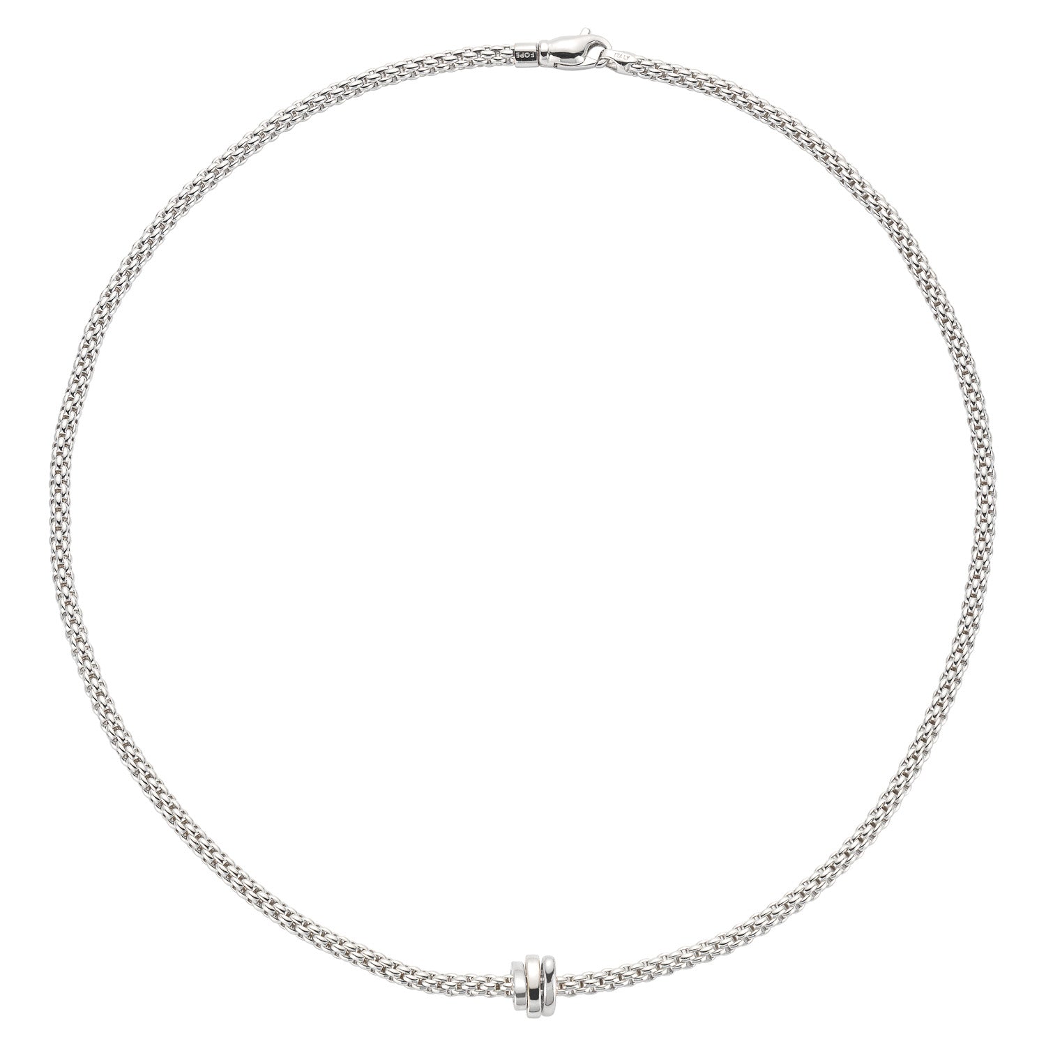 This minimalist necklace from FOPE’s Prima collection embodies understated elegance through its clean lines and signature woven texture. Crafted in 18ct rose, yellow, or white gold, the 43cm Prima chain sits beautifully along the collarbone, offering a smooth, flexible feel that defines the collection.
