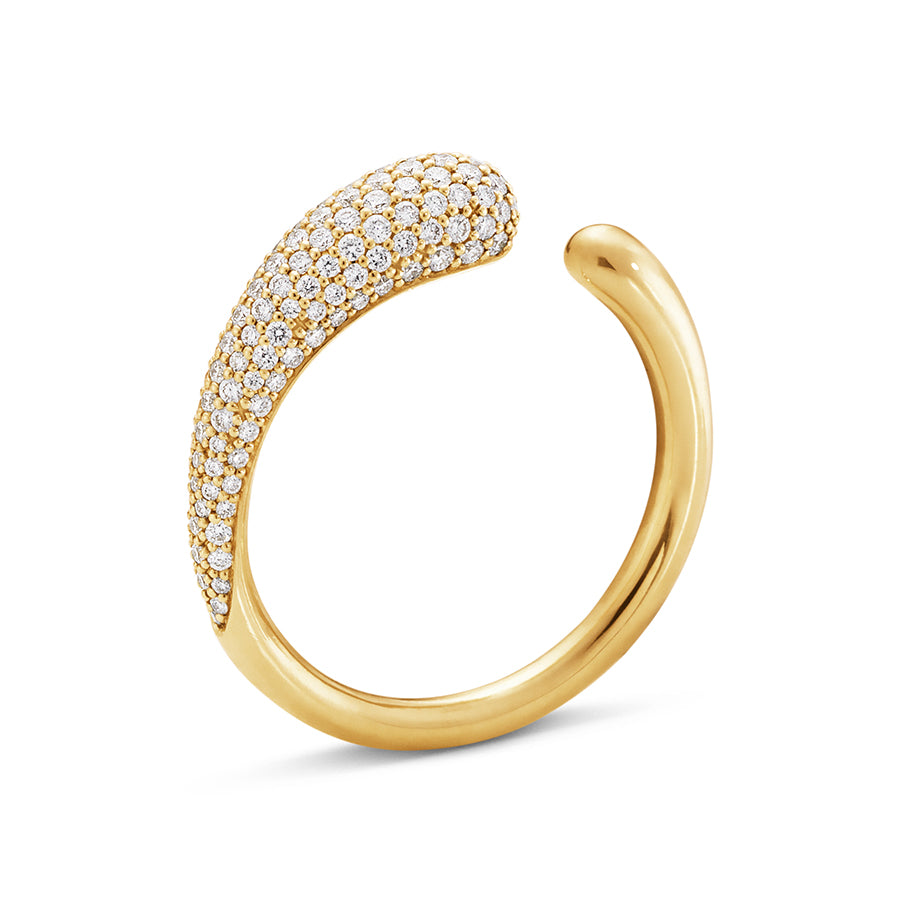 A single strand of yellow gold twists around the finger, one end glistening with pavé-set diamonds in this sensuous and organic ring. Inspired by the passage of time with the gap perhaps representing a pause for thought, the ring is understated enough to work stacked with others but also eye-catching in its fluid form to create a statement by itself.