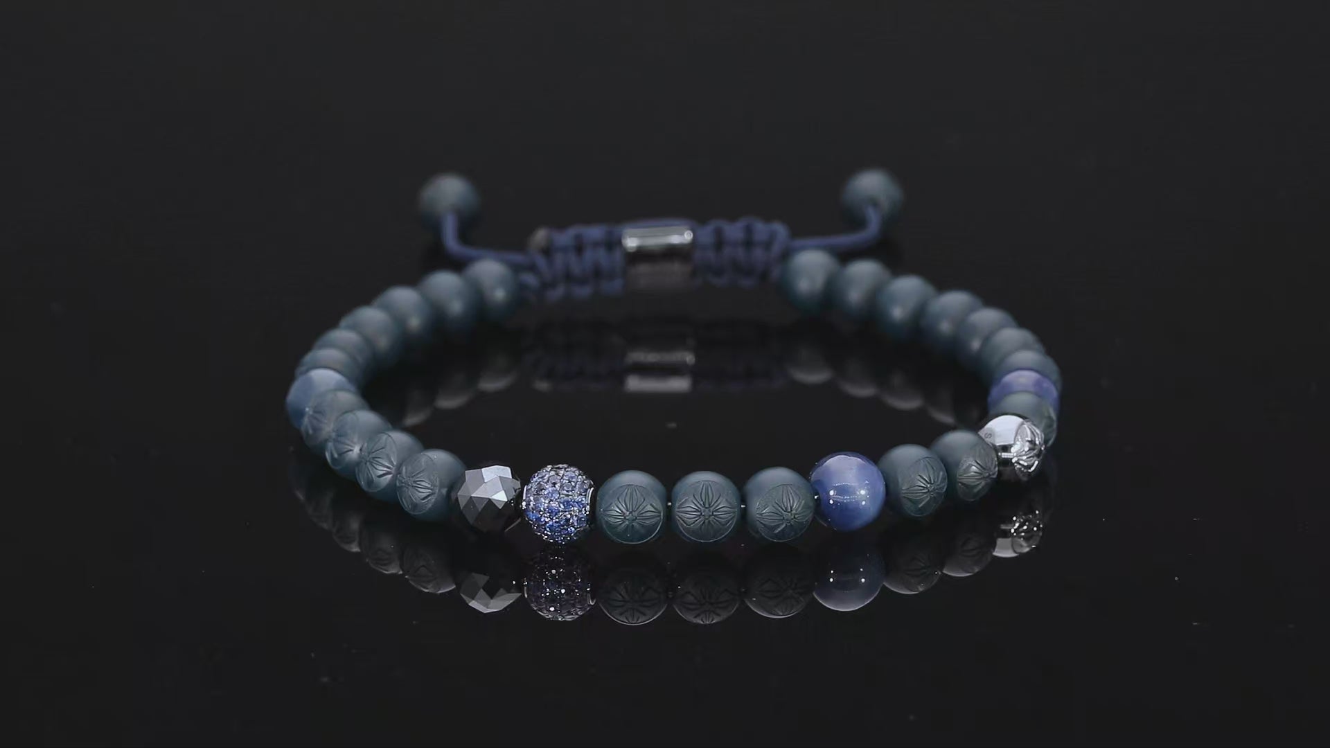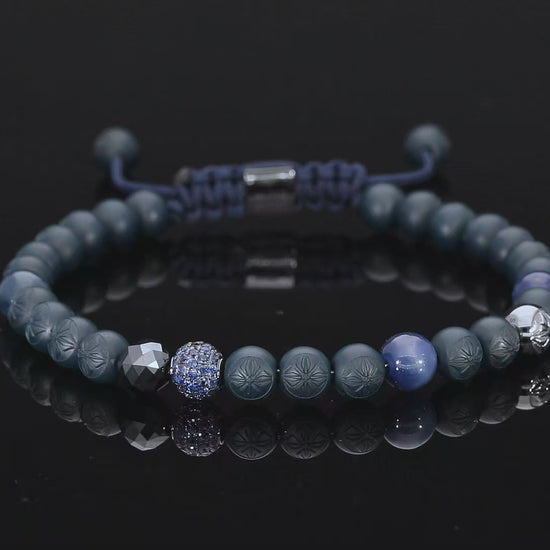 Sleek and tonal, the 6mm SHAMBALLA® Non-Braided Bracelet pairs 18K white gold veiled in black rhodium with a cool, oceanic palette. The slender, non-braided line sits close to the wrist, balancing inky brilliance with velvety texture: a solid faceted black diamond anchors the composition, while blue sapphires and matte ceramic add measured depth and modern calm. Framed by a vibrant blue string, it reads contemporary and assured—refined on its own, striking in a stack, and fully customizable in Creator.