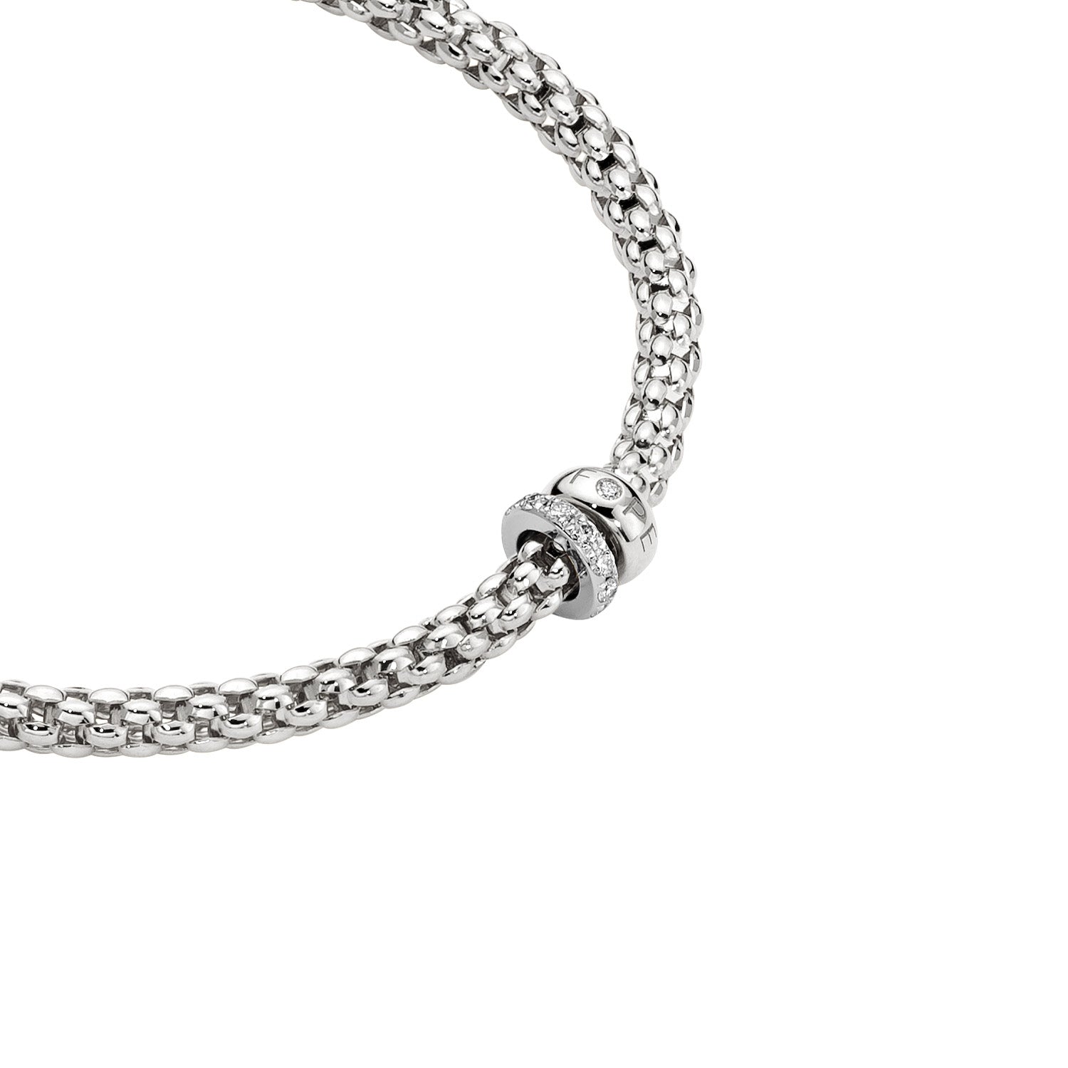 This necklace features the iconic Prima flexible link chain in 18ct gold, designed to move softly and comfortably with the wearer. At its centre sit two beautifully set diamond rondels: one classic diamond rondel and one FOPE logo rondel, adding depth, character, and a refined touch of sparkle. The effect is understated yet unmistakably sophisticated.