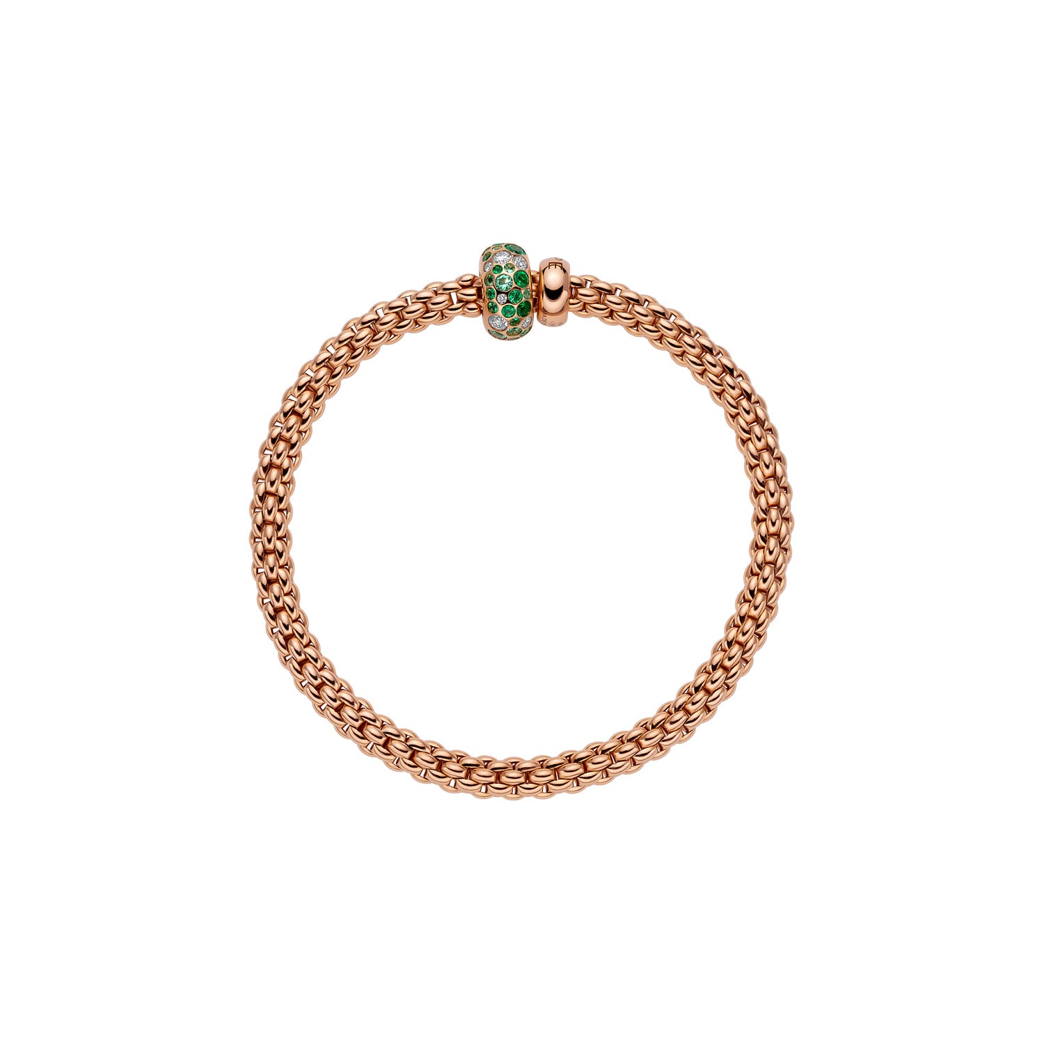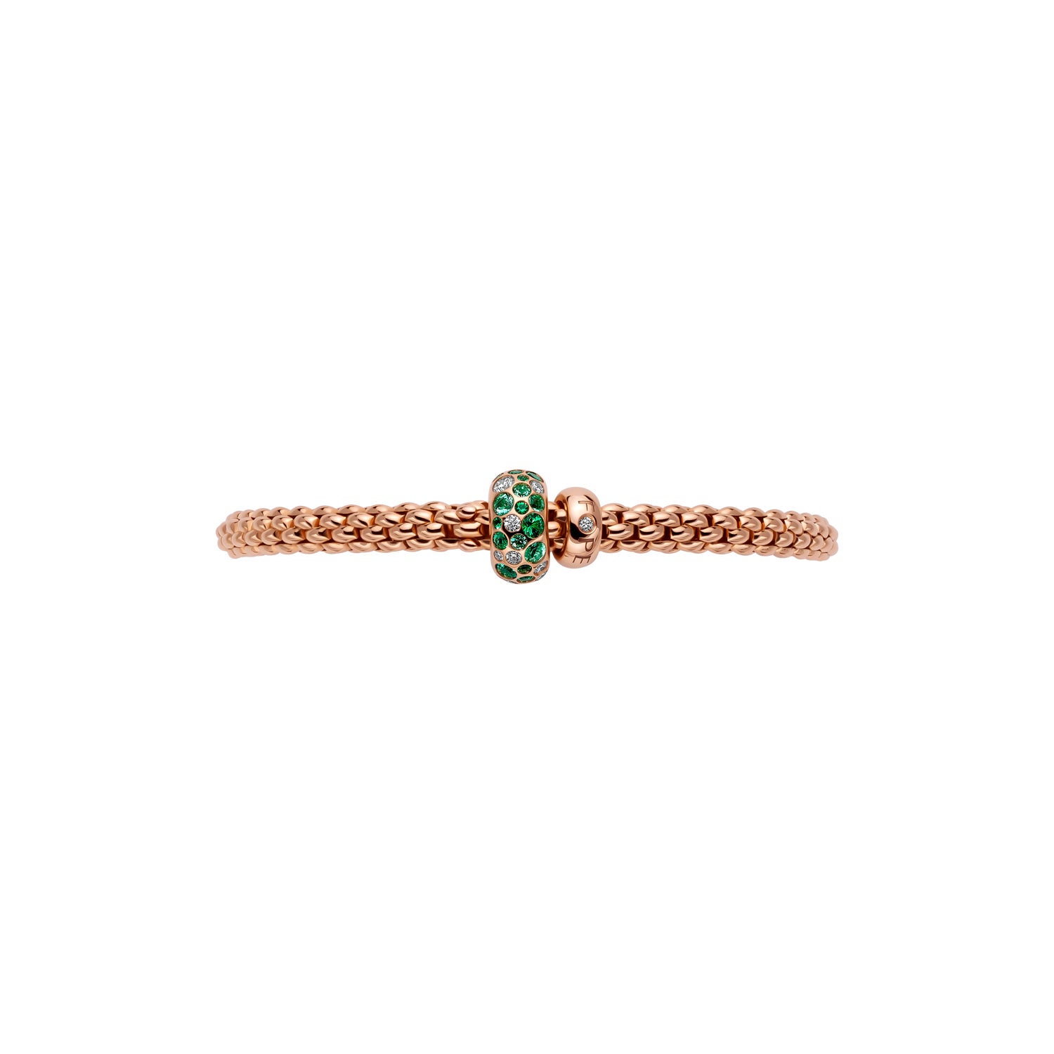 This luxurious Solo bracelet is crafted from 18ct rose or yellow gold and features FOPE’s iconic flexible gold mesh, adorned with a pavé-set rondel of vibrant emeralds and sparkling white diamonds. The rich green of the emeralds contrasts beautifully with the brilliance of the diamonds, creating a timeless design with a contemporary edge.